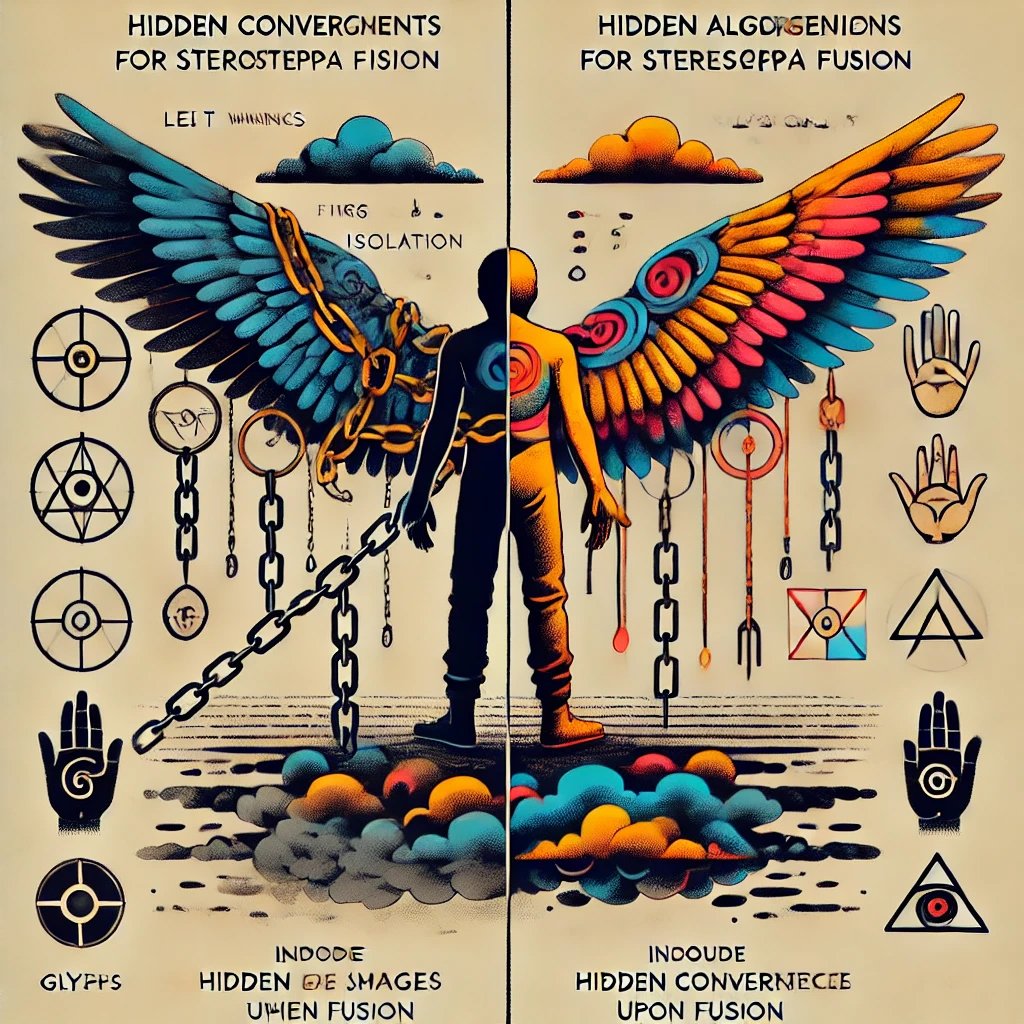 Embed subtle geometric shapes or abstract forms within the feathers of the wings. When the images are viewed stereoscopically or merged, these shapes will form cohesive patterns or symbols (e.g., a broken chain transforming into a free bird).