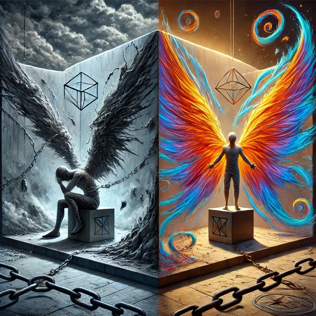 Check that the hidden visuals (in the wings, chains, or imagination cloud) appear when the images are merged. These could form new symbols or suggest additional layers of meaning (e.g., freedom vs. restriction).