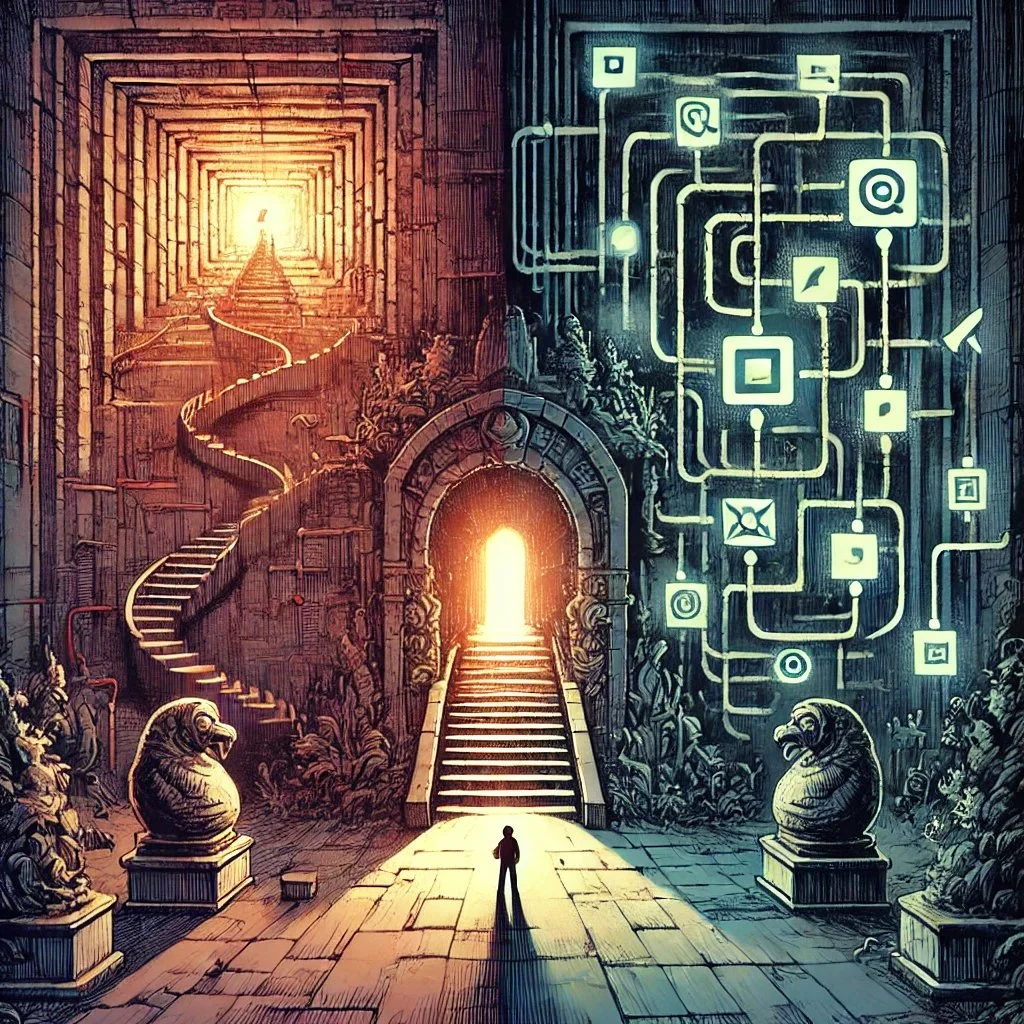 In a sprawling maze-like cityscape, blending ancient stone walls with sleek modern glass buildings, our protagonist stands at an intersection. The towering walls of the labyrinth represent both timeless challenges and contemporary distractions. Modern symbols like social media icons, work emails, and notifications clutter the maze, intensifying the feeling of overwhelm. The atmosphere is shadowy, dark, and chaotic, symbolizing the confusion of modern life.